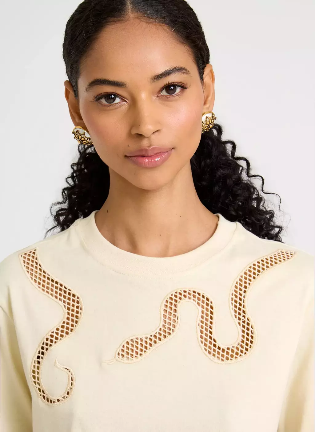 Com DNA BO.BÔ, a Camiseta Serpente Guipir garante elegância, conforto e sofisticação em seus detalhes únicos. Combine-a com acessórios, shorts e complemente com rasteira, para um visual easychic. A Camiseta é confeccionada em malha, possui aplicação de técnica guipir com renda vazada, decote redondo canelado, mangas curtas e acabamento pespontado. Composição: 100% Algodão Cor: Off White